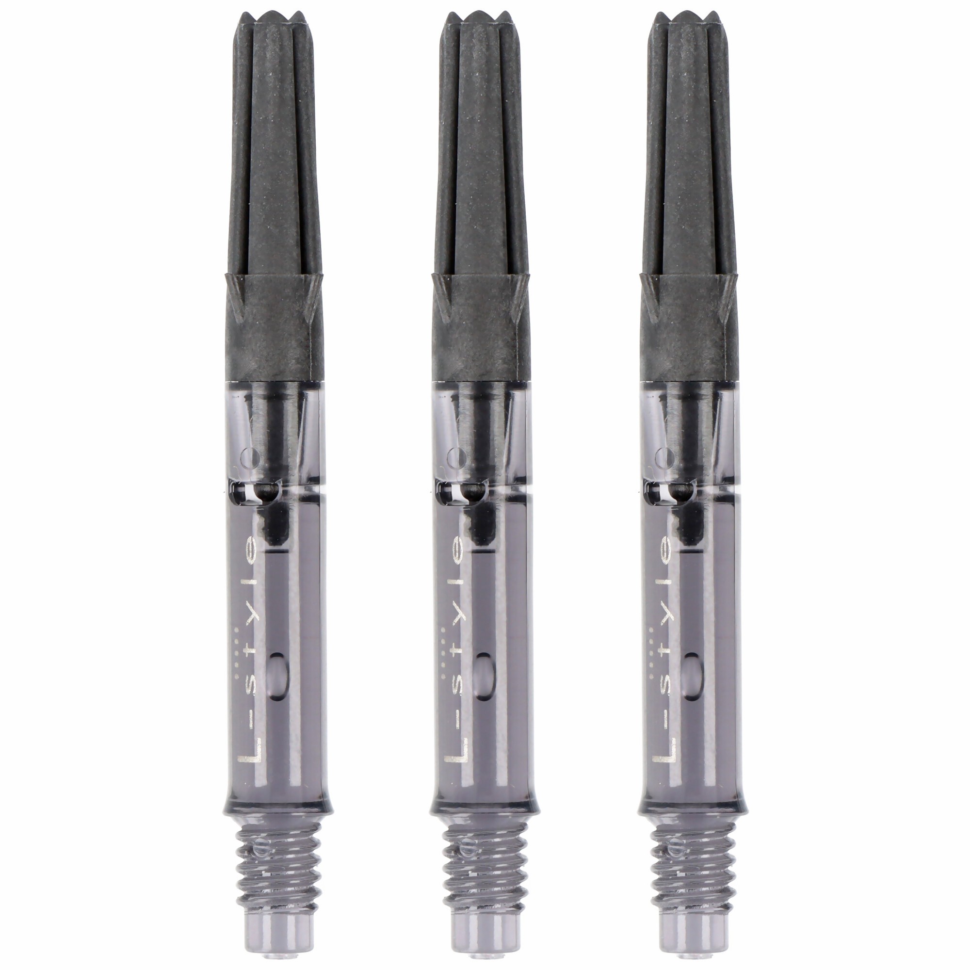 L-Style Schaft Carbon, drehbar, schwarz, 260, 3 Stück kurz und kompakt, unsere drehbaren L-Style Carbon Schäfte stellen sich vor ✅ Spin, Spinning mit Drehfunktion, mit champagne Ring ✅ hochwertige Carbon Shafts von L-Style ✅ schwarzer Shafts mit Flightaufnahme aus Carbon ✅ mit drehbarer Flightaufnahme, dem Spinning Effekt ✅ kann Bouncer und Ablenkungen reduzieren ✅ Carbon L 260 Silent, schont Deine L-Style Dartflights L-Style L-Shaft Silent Straight Carbon, die um 360° Grad drehbaren Spinn-Schäfte LShaft. 3 Stück Schäfte im Lieferumfang. Diese neuen Spinning Dartschäfte sind aus dem sehr robusten Carbon Polycarbonat Material gefertigt und zeichnen sich durch ihre gute Qualität Made in Japan und die materialstarke Langlebigkeit aus. Die Schäfte können mit herkömmlichen Standard Flights oder den ideal dazu passenden L-Style Flights verwendet werden. Die perfekte Kombination mit L-Style EZ Flight oder den Champagne Flight! Im Standard 2BA Gewinde. L-Shaft Silent Straight carbon Black 260 Black Dartschaft drehbar L-Style Silent L-Shaft die geraden Dartschäfte in der mittleren 260 Version. Farbe Schwarz etwas transparent, System: Silent L-Shaft Dartschäfte von L-Style mit der Spinnwelle in gerader Ausführung. Kurz, 26mm lang bis zum Flightanfang, ohne Gewinde bzw. ca. mm Gesamtlänge mit dem Gewinde mm. Hergestellt aus einer sehr gut haltbaren Polycarbonat-Mischung, was diesen Dartschäfte verschafft, das diese mit zu den haltbarsten Schäften am Markt gehören! Spin shaft carbon Diese Schäfte werden mit einer fortschrittlichen, japanischen Technologie entwickelt und gefertigt, sie drehen sich um 360° Grad. Diese L-Schäfte sind ideal für die Verwendung mit den 3 enthaltenen Champagne Rings oder den Shell Lock Rings gedacht bzw. konzipiert. L-Schäfte haben zusätzlich einen Flight Guard integriert, die Flight Guards schützen Deine Flights von der unteren Seite nach oben, Risse oder Beschädigungen können minimiert, verhindert werden. Champagne Rings und Shell Lock Rings halten Deine Flights und sorgen für einen sehr guten Verbund zwischen Schaft und Flight, dadurch können Deine Darts zusätzlich stabilisiert werden. Technische Daten für den L-Style Spin Shaft Carbon Material: Carbon / Polycarbonat Länge: 260 Farbe: schwarz, leicht transparent System: Spinning-Shaft Gewicht: 0,86 Gramm Abmessungen: 46mm mit Gewinde, 39,4mm ohne Gewinde, 26mm L-Style carbon L-Shaft, Carbon L260 Silent, 4582360868163