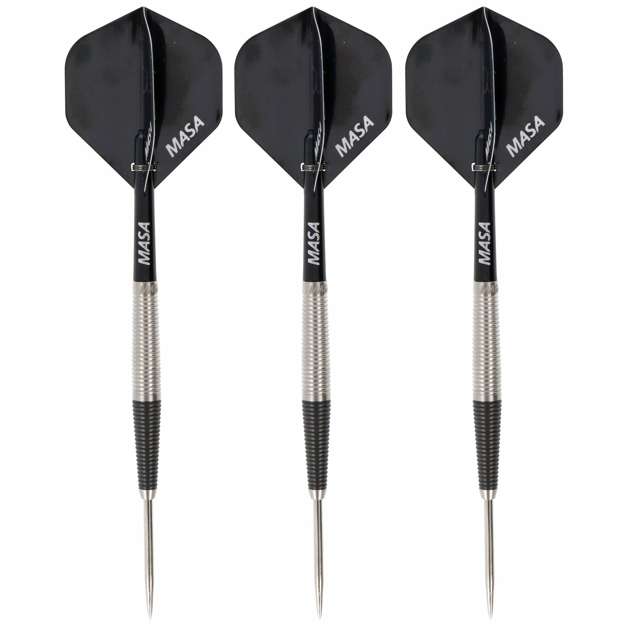 MASA 3 Steeldart, Modell 03, Griplevel 4, 90% Tungsten, 22 Gramm kurz und kompakt, die MASA 3 Steeldarts stellen sich vor ✅ Steeldarts Modell 3 von MASA – Marcel Sandner! ✅ 90% Tungsten ✅ Gewicht 22 Gramm ✅ zwei nahezu identische Gripzonen mit einem schmalen vorderen Gripbereich – ideal für enge Gruppierungen! ✅ hochwertige Premiumbox mit hochwertigem Zubehör von MASA! ✅ inklusive MASA ClickStand – die perfekte Aufbewahrung für deine neuen MASA Darts! Wenn du auf der Suche nach einem Dart bist, der kompromisslose Qualität, klare Formgebung und absolute Kontrolle miteinander vereint, dann wirst du beim MASA 3 Steeldart, Modell 03 sofort zuhause sein. Dieser Dart richtet sich an Spieler, die einen ehrlichen Barrel bevorzugen – ohne überflüssige Designs, ohne Ablenkungen, dafür mit maximaler Performance. Puristisch. Edel. Ehrlich. Genau diese Werte trägt der MASA 3 in jedem Millimeter seiner Konstruktion. Hier bekommst du nicht einfach nur ein weiteres Set Darts – du bekommst ein präzise gefertigtes Werkzeug, das deine Technik respektiert und deine Wurfkonstanz unterstützt. Der MASA 3 ist kein Dart, der laut um Aufmerksamkeit schreit. Stattdessen überzeugt er mit Understatement, einer klassischen Optik und einem Barrel, dessen Form und Verarbeitung perfekt auf Spielpraxis ausgelegt sind. Die Torpedo-Form – gebaut für Kontrolle und enge Gruppen Der MASA 3 ist der erste MASA Barrel, der in einer Torpedo-Form gefertigt wurde. Vielleicht kennst du diese Form schon von anderen High-End-Barrels: vorne etwas breiter, nach hinten leicht verjüngt – ein Shape, der dir zusätzliche Kontrolle beim Release gibt und dir gleichzeitig ermöglicht, engste Gruppen im Triple-Feld zu landen. Die gesamte Silhouette des Barrels ist darauf ausgelegt, stabil und sauber aus deiner Hand zu gleiten. Der leichte Schwerpunkt erlaubt dir eine natürliche, mühelose Wurfbewegung. Für dich bedeutet das: gleichmäßigere Würfe, bessere Wiederholbarkeit und ein präziseres Gefühl für deine Flugbahn. Klarheit in Verarbeitung und Design – Grip, der nur das tut, was er soll Beim Grip setzt der MASA 3, Modell 03 bewusst auf eine mittelstarke Struktur – Griplevel 4/10. Das bedeutet: genug Halt für konstante Würfe, aber eben ohne aggressives Einhaken oder störende Kanten. Die Oberfläche fühlt sich angenehm natürlich an, fast schon unaufdringlich, und schenkt dir ein sicheres Gefühl, ohne deinen Finger zu „zwingen“. Besonders clever: Der Barrel verfügt über zwei beinahe identische Gripzonen. Sie werden nur von einer feinen, glatten Brücke getrennt – dein orientierender Nullpunkt beim Greifen. Du wirst schnell merken, wie intuitiv deine Finger ihre optimale Position finden. Diese diskrete Unterteilung sorgt für ein Wiedererkennungsgefühl bei jedem Wurf. Keine Spielereien, keine visuellen Ablenkungen – nur Funktion. MASA 3 Steeldart – Modell 03: Puristische Kraft trifft edle Präzision Beim Werfen wirst du spüren, dass der MASA 3 perfekt ausbalanciert ist. Der Barrel läuft schlank zu – ideal, wenn du enge Gruppen spielst oder eng platzierte Darts im Triple 20 anstrebst. Die schmale Front bietet dir zusätzliche Freiheit beim Scoring, weil der Dart weniger Fläche blockiert. Gerade fortgeschrittene Spieler lieben dieses Design, weil es ihnen erlaubt, risikolos auf bereits gut getroffene Felder „nachzulegen“. Und wenn du Einsteiger bist? Dann wirst du merken, wie viel Vertrauen dir dieser Barrel vermittelt, weil er sich exakt so verhält, wie du es erwartest. 90 % Tungsten – stabil, langlebig und hochwertig Mit einem Tungsten-Anteil von 90 % ist der MASA 3 deutlich schlanker als vergleichbare 22-Gramm-Darts und gleichzeitig extrem robust. Dieses Material macht keine Kompromisse: hohe Dichte, außergewöhnliche Haltbarkeit und ein Gewicht, das sich perfekt verteilen lässt. Du bekommst ein hochwertiges Profi-Niveau – egal, ob du zuhause, im Verein oder auf Turnieren spielst. Das Barrelgewicht (inklusive Spitze) liegt bei genau 22 Gramm – ein beliebtes und absolut alltagstaugliches Gewicht, das dir Stabilität und Präzision gleichermaßen bietet. Limitierte Erstauflage – nur 100 Sets weltweit Ein echtes Highlight: Die Erstauflage des MASA 3 umfasst nur 100 nummerierte Sets. Wenn du dir dieses Modell sicherst, hältst du ein Sammlerstück in der Hand, das bewusst in kleiner Serie gefertigt wurde. Jedes Set trägt seine eigene Nummer – ein Detail, das dem Dart etwas sehr Persönliches und Exklusives verleiht. Die Premium-Magnetbox – edel, stabil und würdig für deinen neuen Dart Geliefert wird der MASA 3 in einer hochwertigen Premium-Magnetbox. Sie schützt deine Darts nicht nur zuverlässig, sondern wirkt wie ein elegantes Präsentationsstück. Der Deckel öffnet und schließt mit einem satten, sanften Magnetmechanismus – genau das richtige Ambiente für ein Dartset dieser Klasse. Und weil MASA an alles gedacht hat, bekommst du zusätzlich deinen MASA ClickStand gratis dazu. Ein stilvoller, funktionaler Platz für deine Darts – perfekt fürs Training, fürs Regal oder für den Schreibtisch. Handgefertigte Stahlspitzen – strukturiert für perfekten Halt Jeder Barrel des MASA 3 wird mit einer 30 mm Steeldart-Spitze geliefert, die von Hand strukturiert wurde. Dadurch erhältst du einen optimalen Halt im Board – nicht zu aggressiv, nicht zu glatt, sondern präzise auf professionelle Anforderungen abgestimmt. Der Unterschied ist nicht nur spürbar, sondern sichtbar. Das komplette Set – alles, was du brauchst Wenn du das MASA 3 Steeldartset, Modell 03 bestellst, bekommst du ein umfassend ausgestattetes Paket: 3 x MASA 3 Barrels (Modell 03, 90 % Tungsten, 22 g) mit handstrukturierten 30 mm Stahlspitzen 3 x 35 mm MASA Silver Shafts (schwarz) inkl. Aluminiumringe 3 x MASA Flights (150 Micron, schwarz, Standardform) 1 x MASA ClickStand 1 x Premium Magnetbox Barrelmaße: Länge 52 mm · Durchmesser 6,9 mm Farben: Silber und Schwarz Du kannst das Set